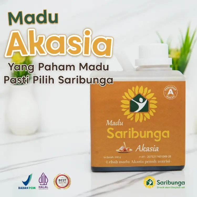 Madu Akasia Saribunga diambil dari hutan Akasia Sumatera, diproses tanpa pemanasan, sehingga enzim, vitamin, dan nutrisinya tetap utuh.