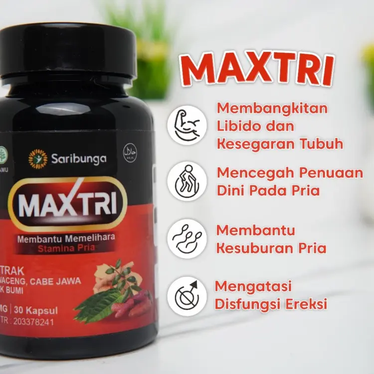 MAXTRI adalah suplemen herbal khusus pria yang diformulasikan dari bahan alami berkualitas tinggi untuk membantu: