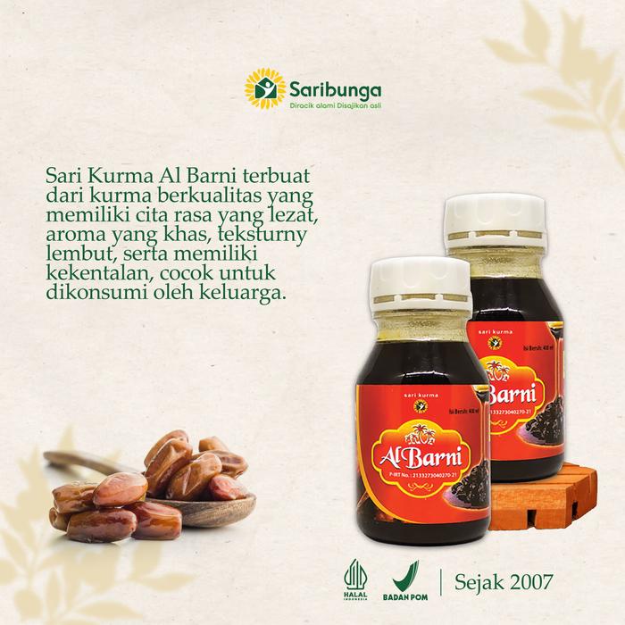 Sari Kurma Al Barni terbuat dari kurma berkualitas yang memiliki cita rasa yang lezat, aroma yang khas, teksturnya lembut serta memiliki kekentalan, cocok untuk dikonsumsi oleh keluarga.