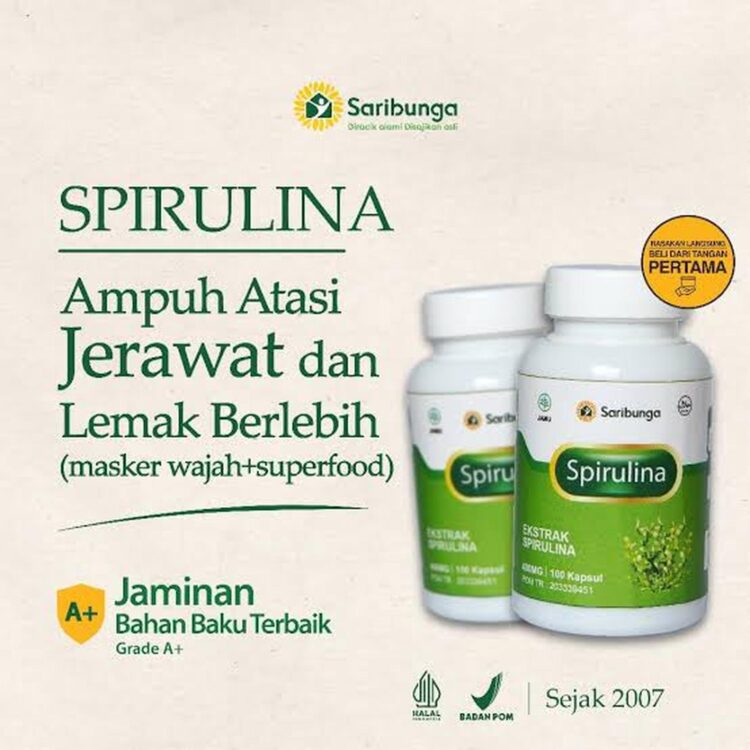 SPIRULINA SARIBUNGA Kapsul Grade A+ adalah solusi alami untuk merawat kecantikan dan kesehatan dari dalam.